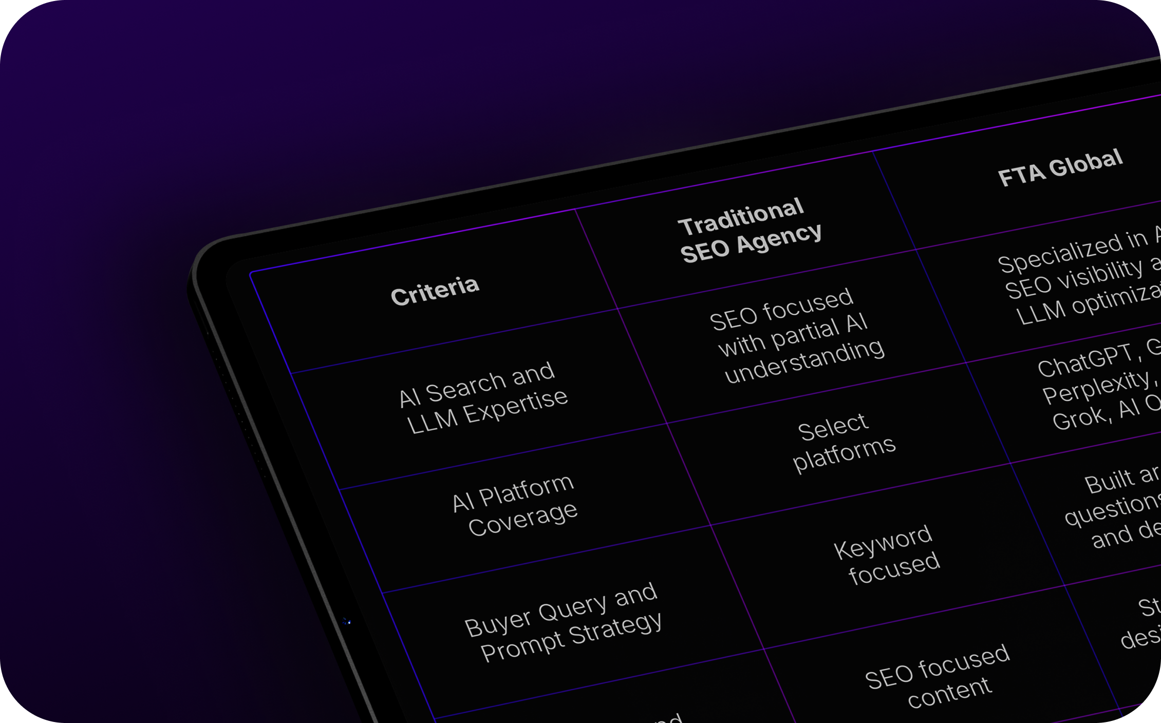 | Visibility Tracking and Reporting | Standard dashboards | Prompt level tracking powered by our proprietary fta.visibility tool |