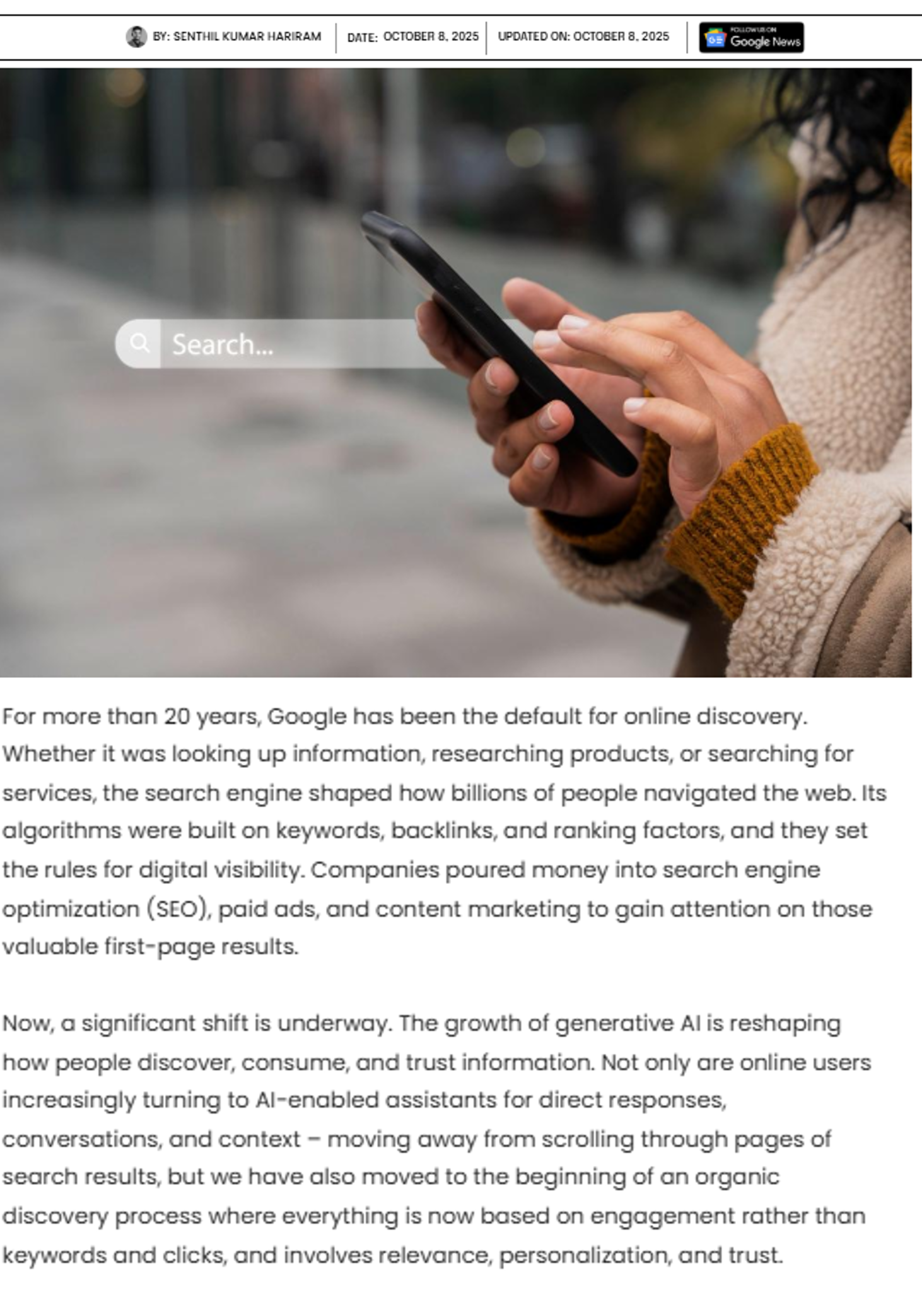 In an authored article for TechGraph, Senthil Kumar Hariram, Founder and MD, FTA Global, explores how this transition is reshaping how brands are found and evaluated.