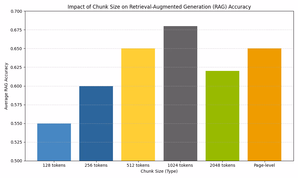 The size of each chunk matters. Small chunks (128-256 tokens) provide high retrieval precision but may lack context; large chunks (2,048 tokens) capture more context but dilute the embedding. A series of experiments across multiple datasets found that medium‑sized chunks around 512-1,024 tokens often achieve the best balance. In particular, page‑level chunking, where each page of a document becomes a chunk, achieved the highest average accuracy of roughly 0.65 across diverse datasets.