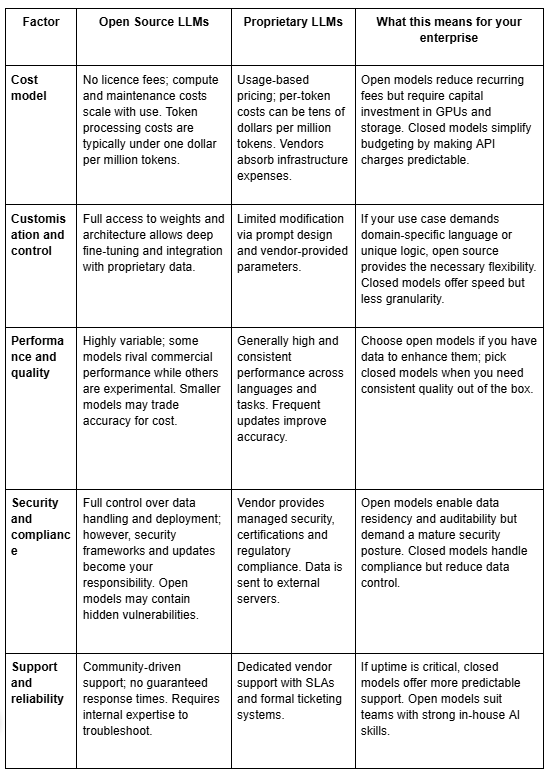 When evaluating a new technology, leaders naturally look at the price. Open source LLMs are often described as “free” because there are no license fees, but that can be misleading. Running even a medium‑sized model requires specialised hardware, networking and ongoing maintenance. Consider the differences: