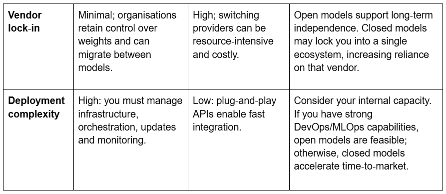 Many organisations ultimately choose a hybrid approach using open models for internal analytics or regulated data, while adopting closed models for high‑stakes public interfaces.