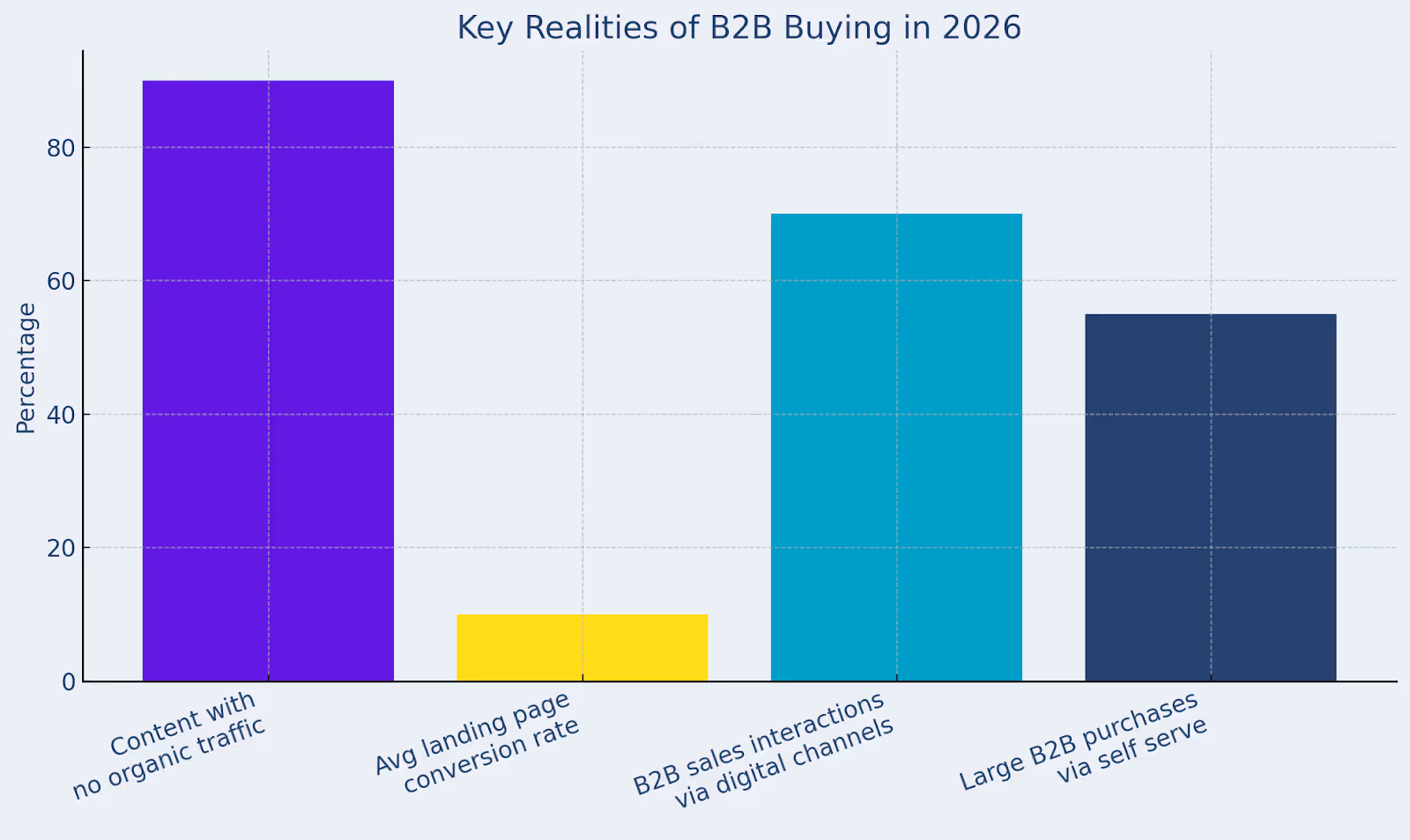 The chart below shows a clear imbalance in the current B2B funnel. Most content never gets discovered, and landing pages convert poorly, yet buyers are making the majority of their decisions in digital, self-serve environments. The gap between how teams build funnels and how buyers actually buy is where pipeline loss begins.