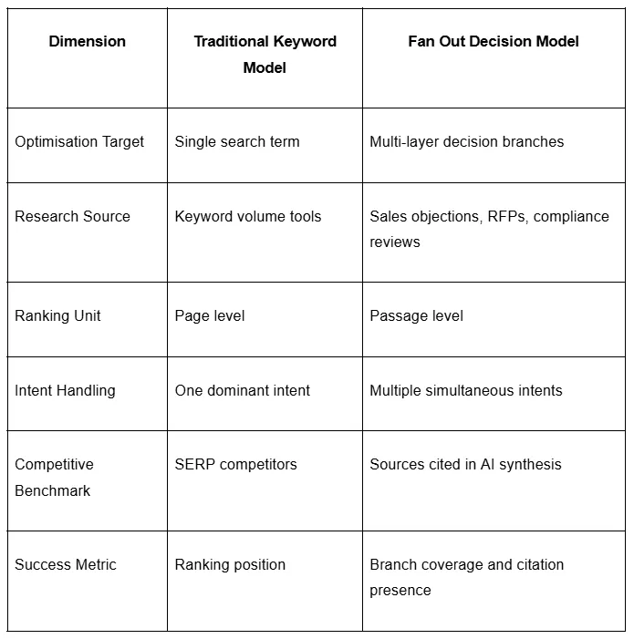 Traditional SEO optimises around explicit phrases with measurable volume. Fan out SEO optimises around implicit decision logic that rarely appears in keyword tools.