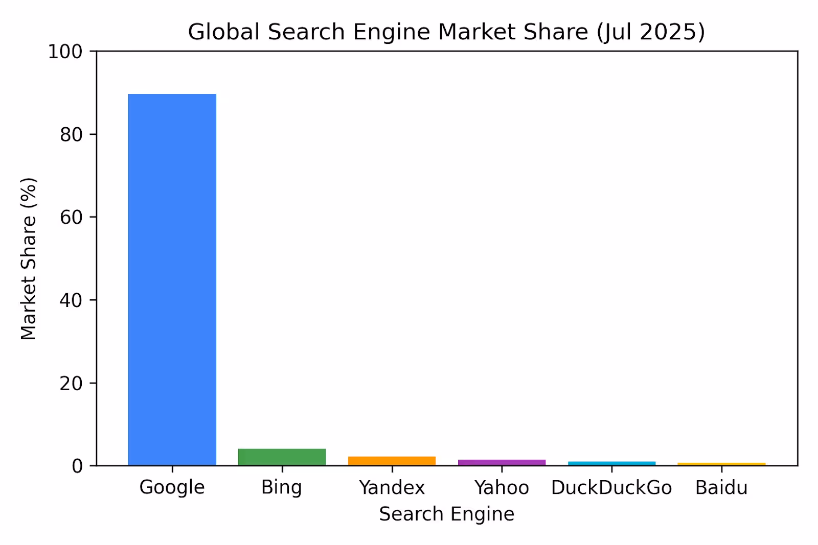 - Statcounter’s July 2025 report shows Google controlling 89.57% of the worldwide search engine market share, with Bing at 4.02%, Yandex at 2.19%, Yahoo! at 1.49%, and DuckDuckGo at 0.95%.