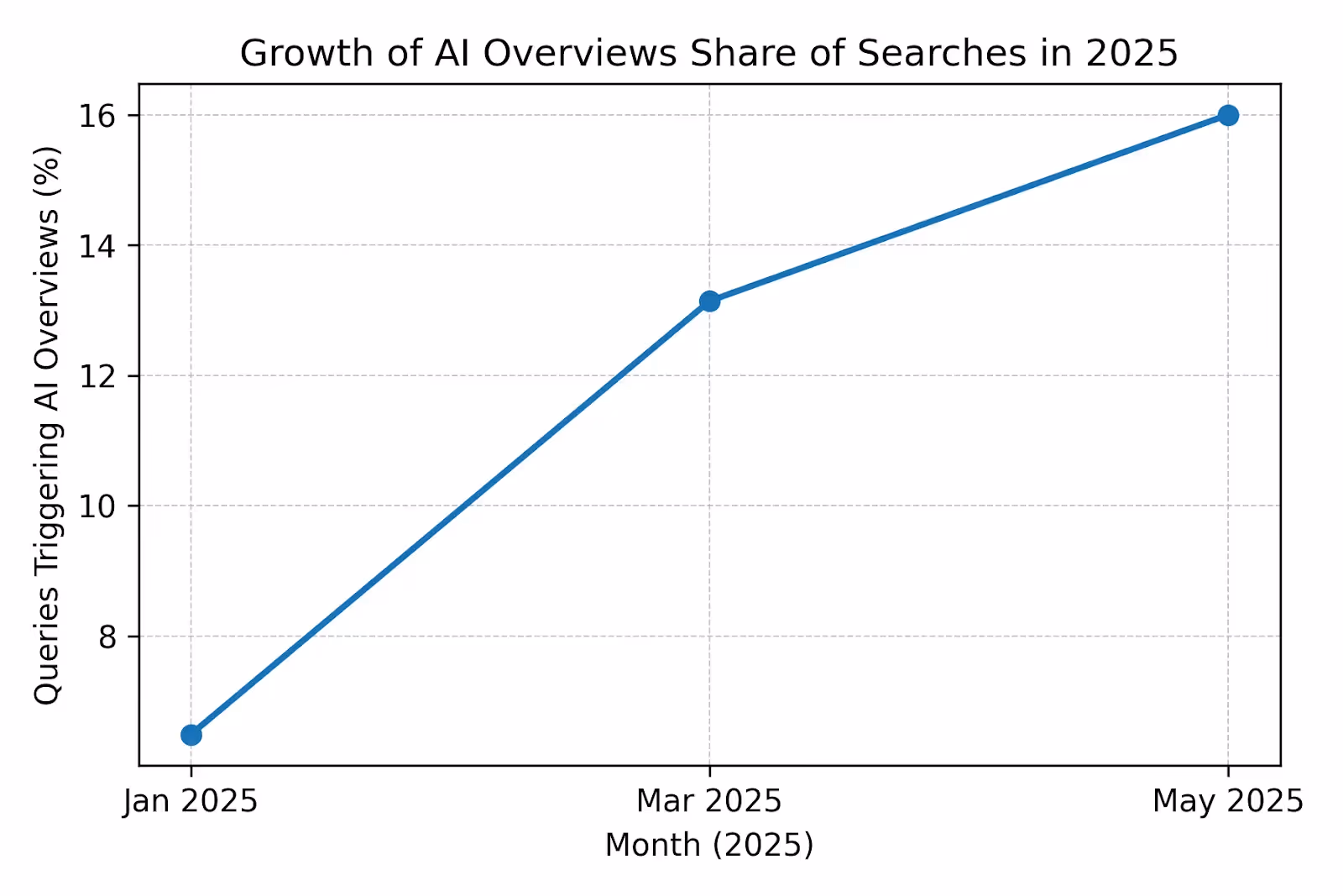- Semrush found that by March 2025, AI Overviews appeared for 13.14 % of all Google searches – double the 6.49 % observed in January.