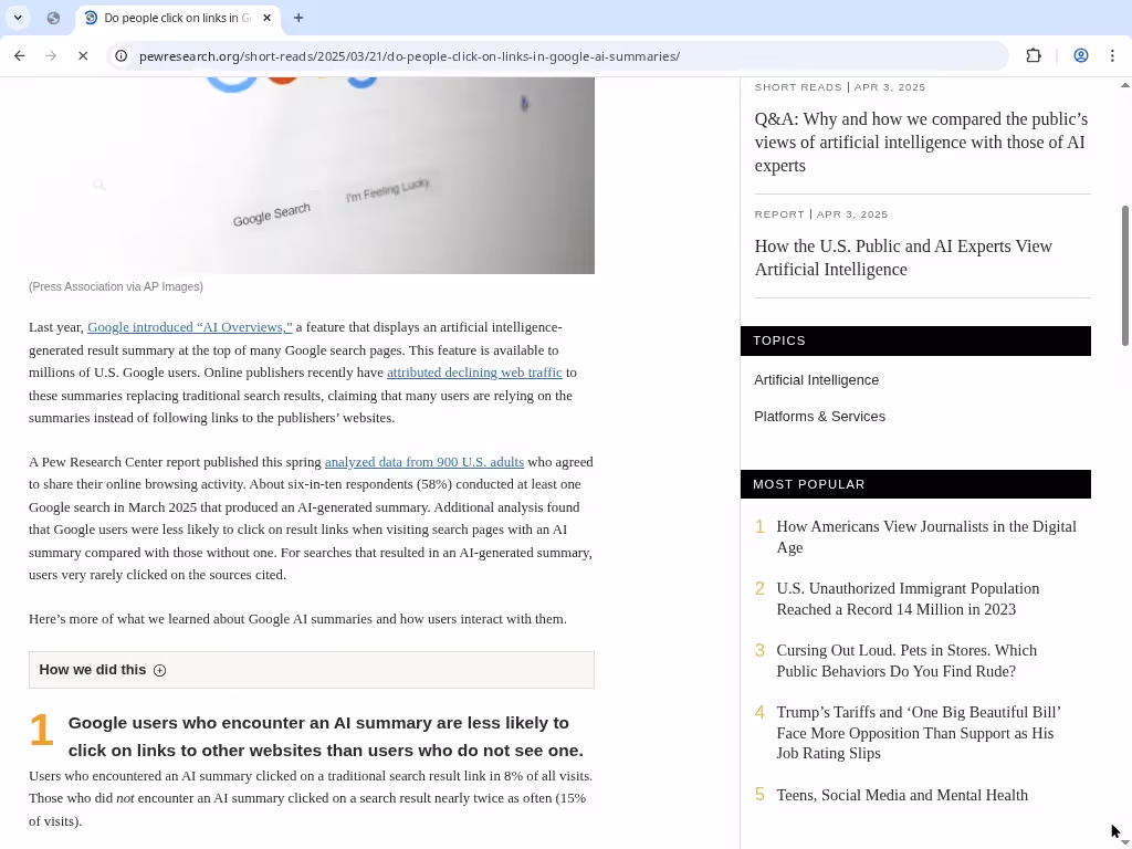 Analysis from Pew Research (based on data from 900 US adults) found that 58% of participants encountered an AI summary during March 2025 searches, and these users were less likely to click on links compared with those who did not see an AI summary.