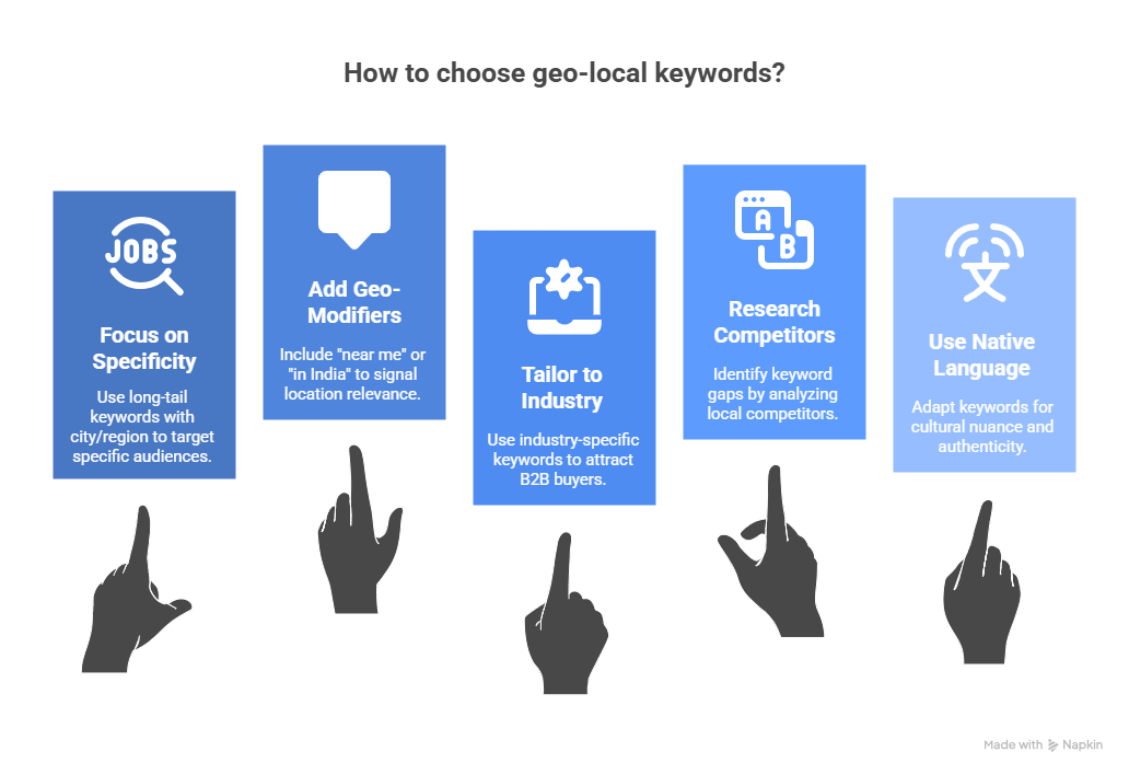 - Add geo-modifiers like ânear meâ or âin Indiaâ to signal location relevance to search engines.