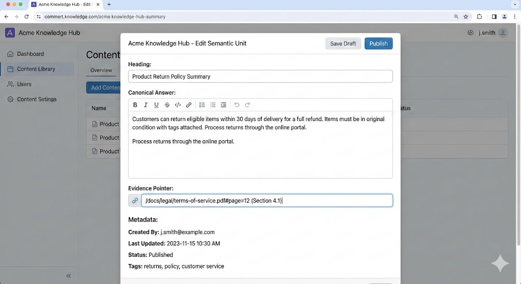 An example to help you better understand this within your CMS with a heading, canonical answer, evidence pointer, and metadata.