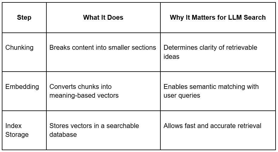 Indexing in LLM systems means building a searchable library of your content so the LLM's retrieval engine can find it later.