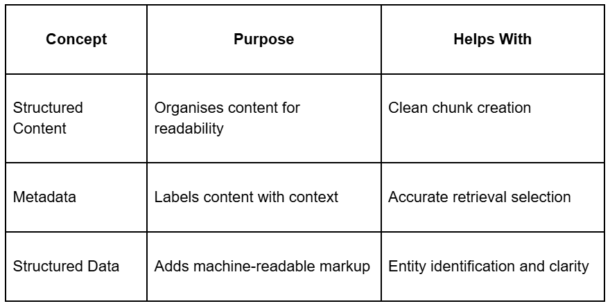 - Content structure determines how clearly ideas are separated before indexing. Clean structure leads to accurate chunk retrieval.