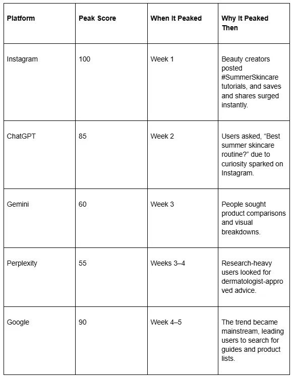 At FTA global, we tracked the spread of “summer skincare routine” across five platforms over six weeks. We used a trend intensity score (0–100) where 100 represents the platform’s peak search volume or engagement during our study.