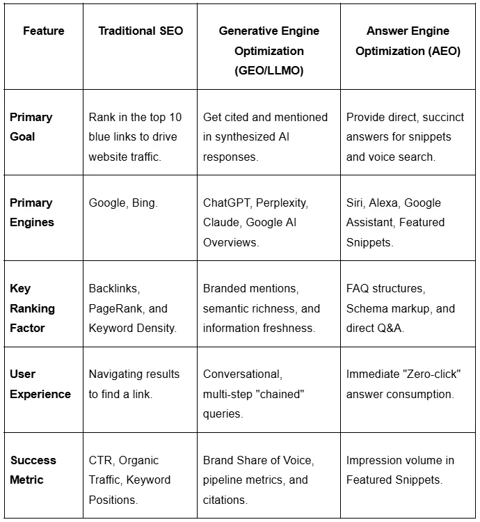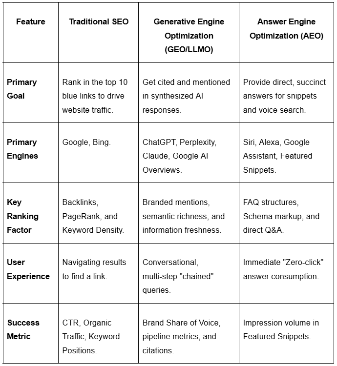 - LLMO and GEO are additional layers on top of traditional SEO, focusing on how AI models synthesize and cite information rather than just ranking links.