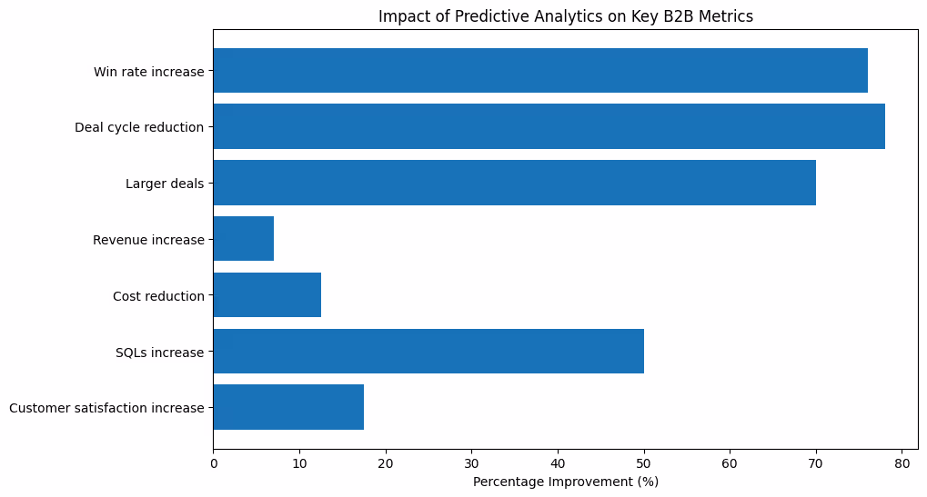 A simple way to visualise this is to map percentage improvements across a range of metrics drawn from published case studies. The chart below compares how predictive analytics has boosted win rates, shortened deal cycles, increased average deal sizes, lifted revenue, reduced costs, delivered more sales‑qualified leads and improved customer satisfaction.