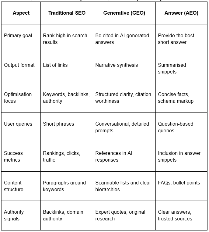 Traditional SEO still drives discovery. However, generative engine optimisation (GEO) determines citation, and answer engine optimisation (AEO) determines extractability.