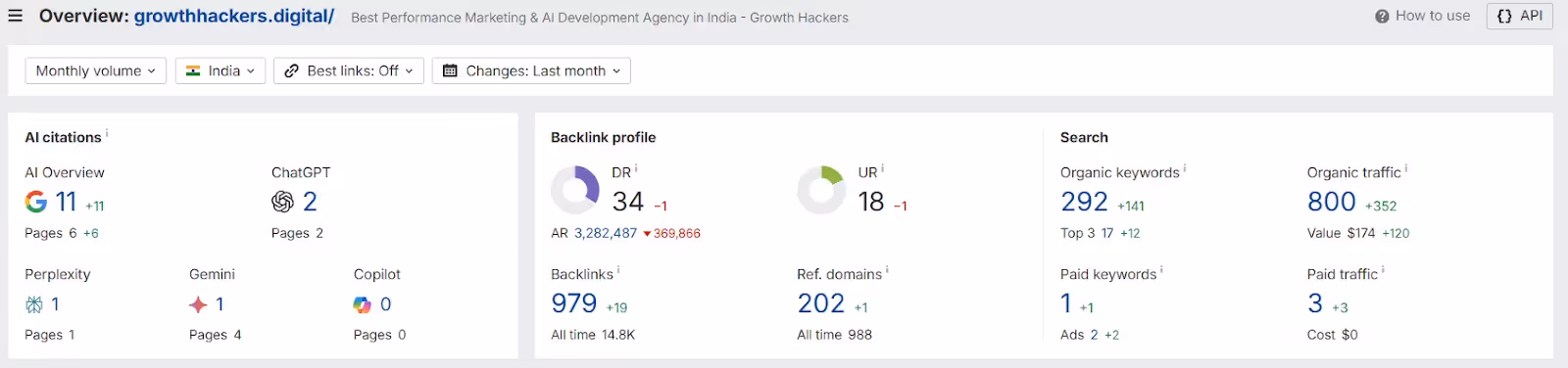 - Backlink strength is limited (979 backlinks, DR 34), but the growth trajectory highlights agile experimentation paying off.