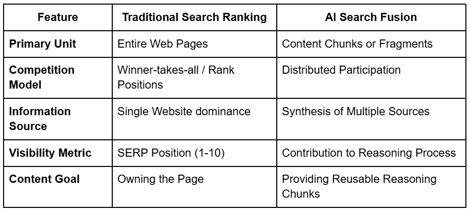 The shift from traditional ranking to AI fusion represents a fundamental change in how AI visibility is measured and achieved.
