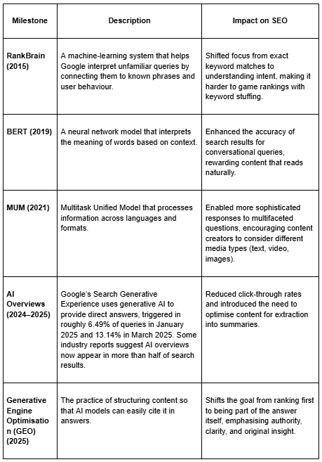 Artificial intelligence has been quietly powering search for years. This long arc explains the AI's impact on SEO over time. Below is a summary of key milestones in the evolution of SEO technology. Understanding these developments helps CMOs appreciate why AI SEO requires new tactics.
