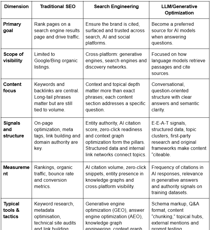 Search engineering, traditional SEO and LLM optimization share similarities but diverge in their goals, inputs and metrics. The following table summarizes the key differences: