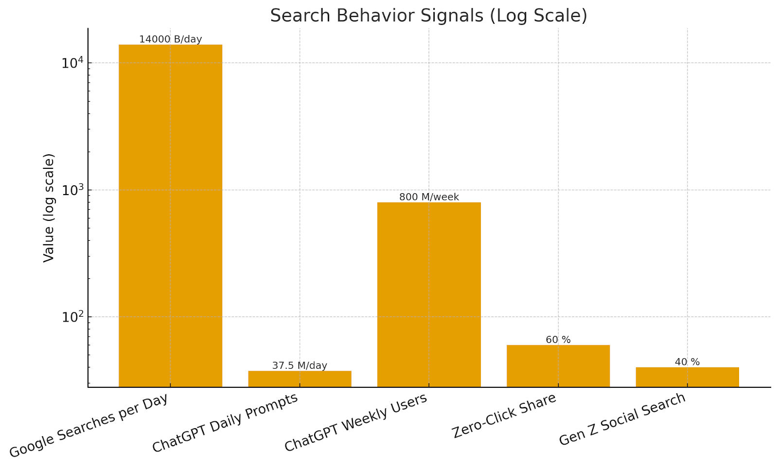 The following graph visualizes several trends shaping search today. It highlights the scale of Google searches versus ChatGPT prompts, the growth of ChatGPT’s weekly active users, and shifts in user behaviour such as zero‑click searches and social discovery.
