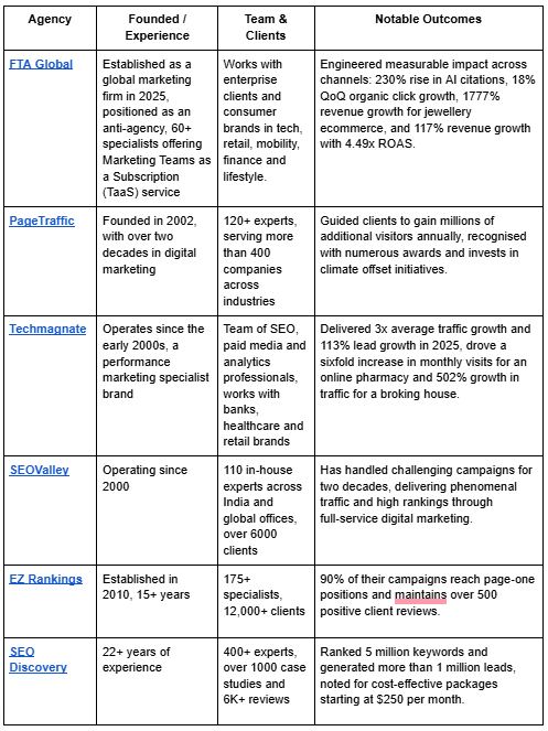 Here is a comparison of the top 8 SEO agencies in India. The table below highlights founding year, team size, client achievements, and notable outcomes.