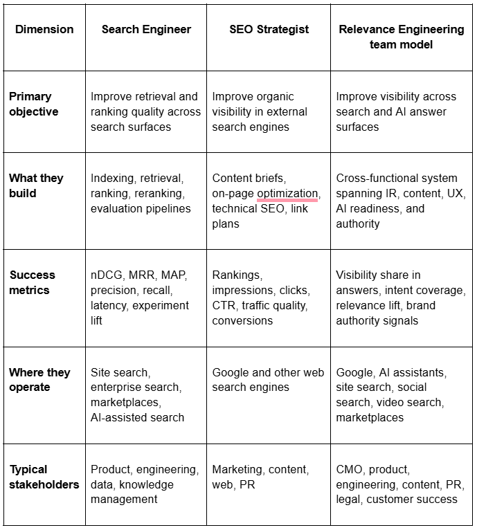 If you are a CMO, the practical difference is simple: SEO influences inputs, search engineering governs how the machine selects and orders outputs.