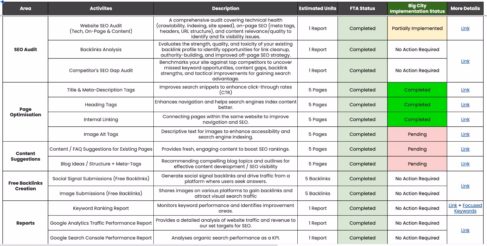 (This dashboard screenshot shows how a structured gig team drives clarity in execution. It highlights every SEO task completed by the FTA Gigs team, the exact implementation status on the client side, and where pending actions are slowing down results.)