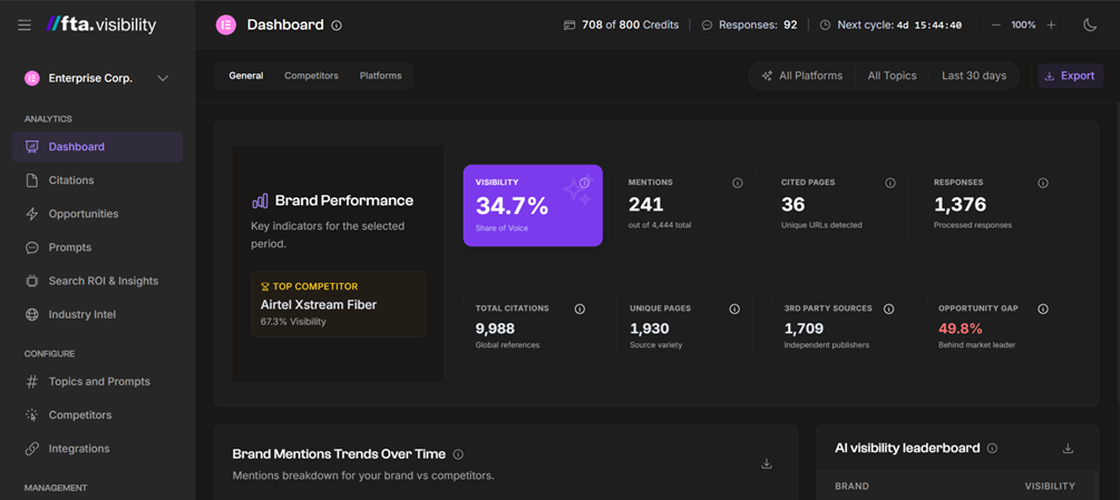 - A governed crawl cycle. You define your prompts, your competitors with their brand variations, the personas your real buyers represent, and the data sources that prove impact. The platform runs those prompts across ChatGPT and Perplexity weekly, four times a month, and parses every response for mentions, citations, exact pages cited, and competitor activity. Google Gemini, Claude, and Google AI Mode are on the roadmap.