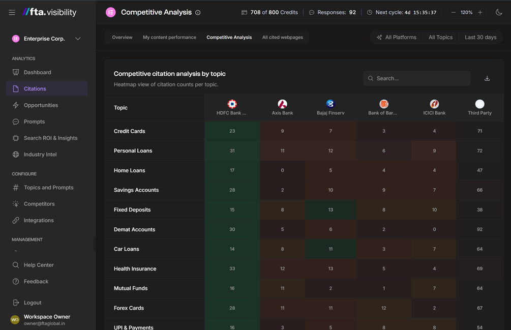 The heatmap shows how citations and mentions distribute across topics and brands. At a glance, you can see where you lead, where rivals dominate.