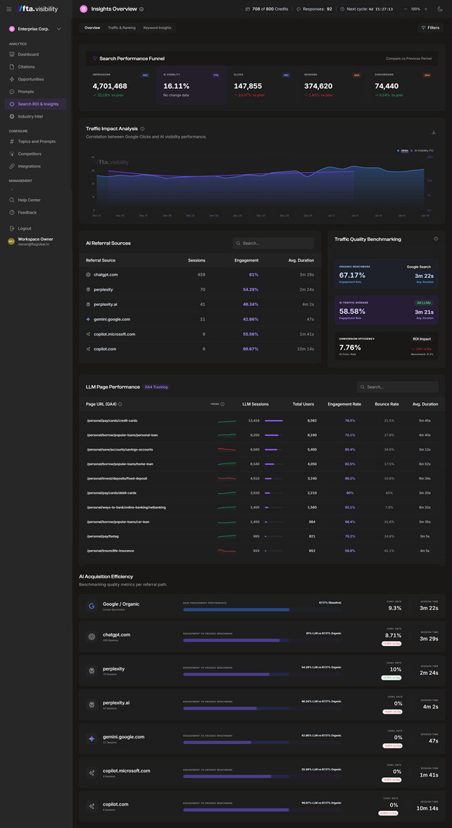- The traffic quality view sits beneath it all, comparing how AI-sourced visitors engage relative to Google organic traffic.