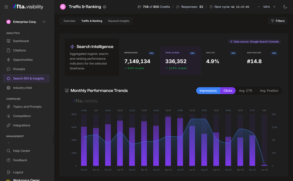 - The unified data overlay. Google Search Console, GA4, and AI visibility data sit on the same timeline. You can see how AI visibility correlates with traditional impressions and clicks, and whether AI-sourced traffic engages at a different rate than Google organic.