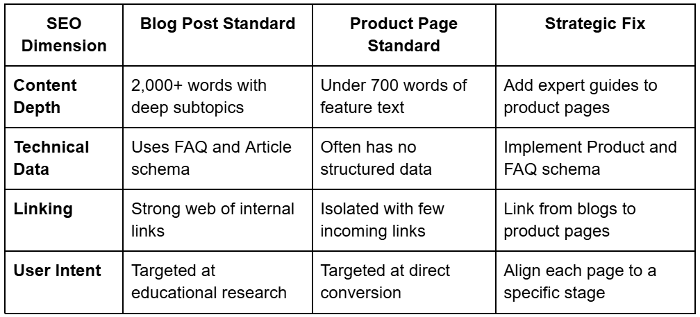 Product pages are frequently built with conversion as the sole objective, leaving them with little SEO strength compared to blog content.