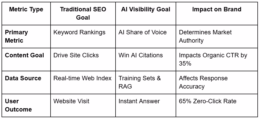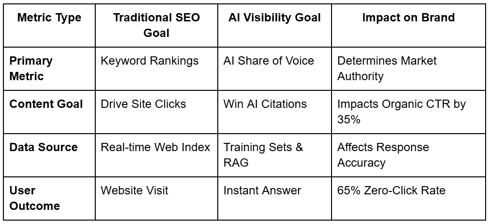 Traditional SEO measures where you sit on a list of links. AI share of voice measures how often an AI mentions or recommends your brand compared to everyone else in your industry.