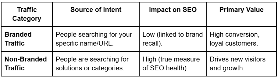 Branded traffic comes from users who already know who you are. They type your company name or a specific product name into Google. Non-branded traffic comes from users searching for a solution to a problem without a specific company in mind.