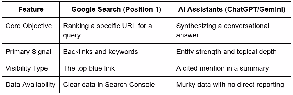 Ranking at the top of Google used to mean you were the undisputed answer for a query. However, AI Overviews and assistants like ChatGPT use a different logic called synthesis.