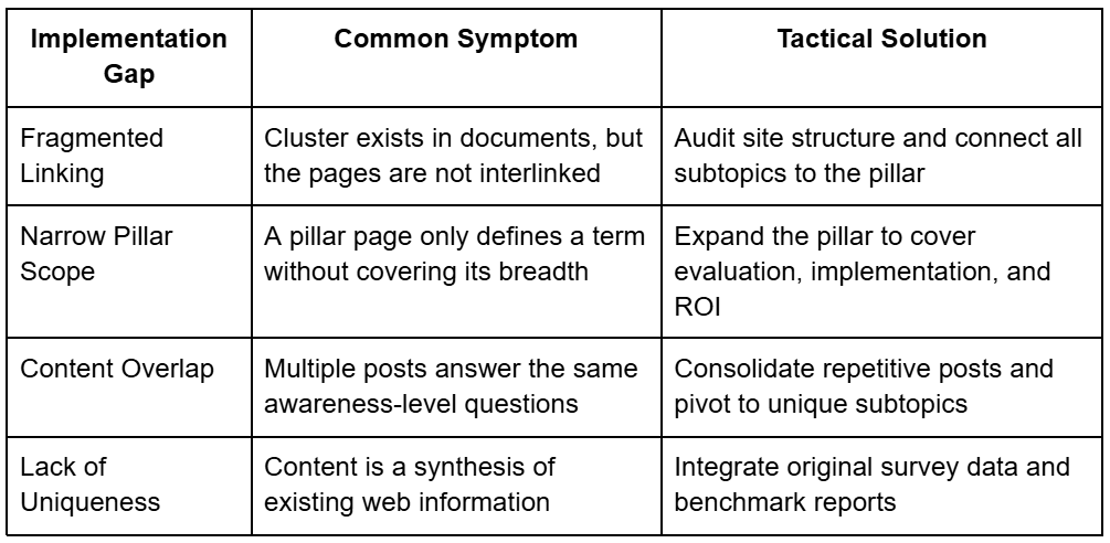 A common mistake is creating pillar pages that only cover the definitional layer of a topic. For example, a pillar might define procurement automation in 1,200 words but fail to cover how to evaluate it or what its implementation looks like.